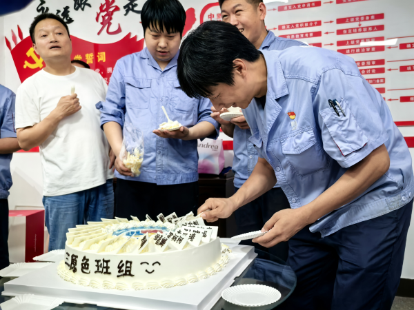 學(xué)習(xí)結(jié)束后,就進(jìn)入了第二個班組活動——回顧往昔,慶?!叭比龤q生日。磨工班組的成員們齊聲喊出“磨工班組三歲啦!”,有人趕忙去拿蛋糕,有人忙著搬桌子,還有人拆蛋糕包裝。組員彭高和高強小心翼翼地拿著蛋糕轉(zhuǎn)來轉(zhuǎn)去,認(rèn)真找著合適的角度,想把這開心的一刻拍下來留作紀(jì)念。作為這個大家庭的一員,每個人都在用心為這場慶?;顒映隽Γ浞终宫F(xiàn)出團隊的凝聚力 。