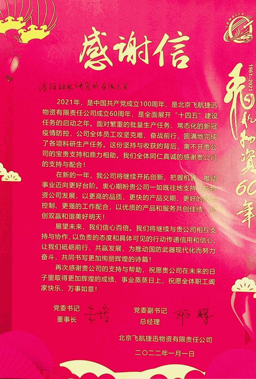 新年伊始,萬象更新。洛陽軸承研究所有限公司(簡稱軸研所)陸續(xù)收到了5封來自航空航天客戶和軍隊工廠的感謝信。信中對軸研所長期以來在軍工科研生產(chǎn)配套任務(wù)和國防武器裝備現(xiàn)代化方面給予的支持和相助表示敬意和衷心的感謝。
